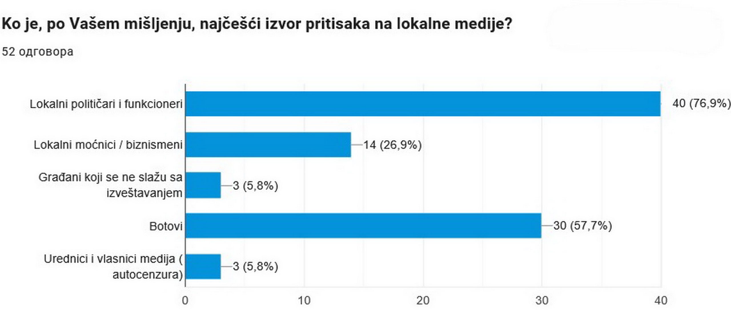 Čak 73,2% anketiranih je upoznato sa pretnjama kojima su novinari izloženi. Kao glavne izvore pritiska (mogućnost više odgovora), građani su identifikovali: lokalne političare i funkcionere 76,9%, botove na društvenim mrežama 57,7%, lokalne moćnike i biznismene 26,9%, vlasnike medija i nezadovoljne građane po 5,8%.Kao najizraženije metode ometanja rada prepoznati su ekonomski i verbalni pritisci, dok 30% građana navodi SLAPP tužbi.