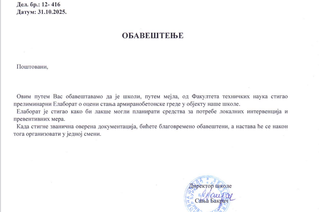 U obaveštenju koje je upućeno roditeljima, direktorka Bakrač navodi da je školi mejlom stigao „preliminarni Elaborat o oceni stanja armiranobetonske grede“ od FTN-a.