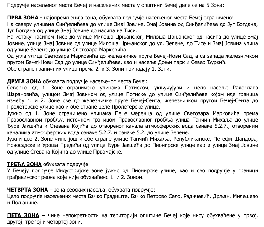 Odbornici Skupštine opštine Bečej na sednici 24. novembra trebalo bi, naime, da donesu odluku o utvrđivanju prosečne cene kvadratnog metra nepokretnosti po zonama u cilju utvrđivanja poreza na imovinu za 2026. godinu. Najskuplje nekretnine nalaze se u I zoni, u kojoj, recimo, kvadratni metar stana košta oko 870 evra, a to znači i viši iznos poreza na imovinu.