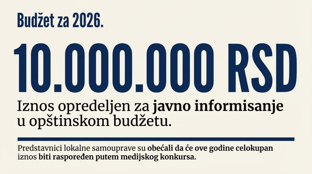 U opštinskom budžetu za 2026. godinu za javno informisanje opredeljeno je 10 miliona dinara. Podsećamo, predstavnici lokalne samouprave su na javnoj raspravi o budžetu u decembru prošle godine obećali da će, za razliku od 2024. i 2025. godine, ove godine celokupan iznos biti raspoređen na medijskom konkursu.