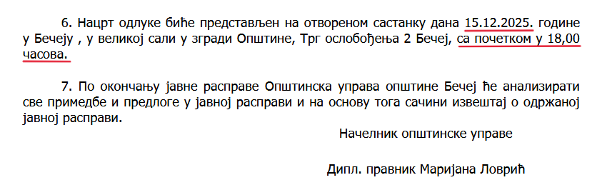 Međutim, dok je problem satnice rešen, ostaje nejasnoća oko trajanja same javne rasprave. Prema Statutu opštine Bečej, javna rasprava mora da traje najmanje 15 dana.