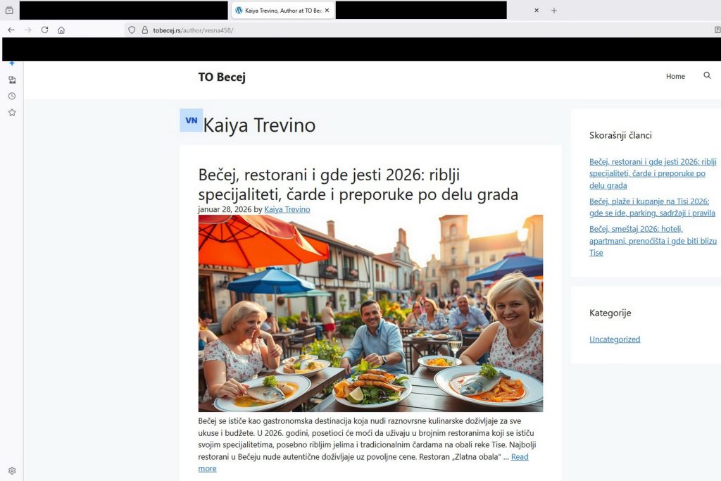 Sajt Turističke organizacije opštine Bečej je SEO „niche“ sajt: koristi se AI da „izbacuje“ članke o Bečeju za 2026. godinu –„Bečej, smeštaj 2026“, „Bečej, restorani i gde jesti 2026“, „Bečej, plaže i kupanje na Tisi 2026“ – kako bi zauzeo prva mesta na Gugl pretrazi.