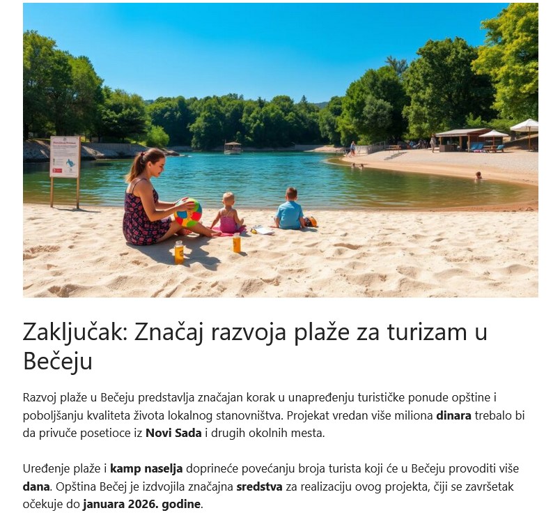 Nekoliko pasusa dalje navodi se: „Uređenje plaže i kamp naselja doprineće povećanju broja turista koji će u Bečeju provoditi više dana. Opština Bečej je izdvojila značajna sredstva za realizaciju ovog projekta, čiji se završetak očekuje do januara 2026. godine“.
