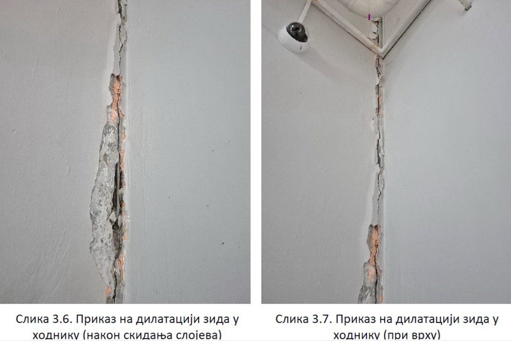 Konstatuje se da „dilatacione zone i pojedine grede u spoju holova pokazuju pojave pukotina u oblozi, ali bez dokaza o prodiranju u noseći betonski presek“.