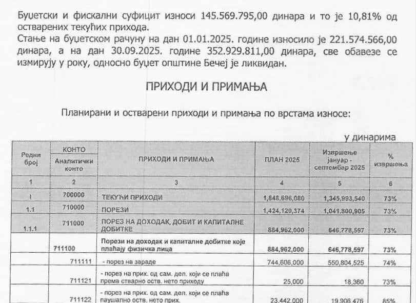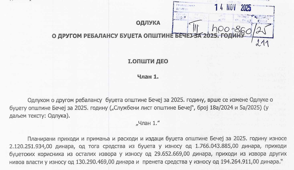 Na sednici Skupštine opštine Bečej zakazanoj za 24. novembar odbornici bi trebalo da usvoje odluku o drugom rebalansu opštinskog budžeta za 2025. godinu, kao i izveštaj o izvršenju budžeta od 1. januara do 30. septembra ove godine. Međutim, ukrštanjem ova dva dokumenta uočava se nelogičnost u vezi sa iznosom prenetih neutrošenih sredstava iz 2024. u 2025. godinu – iznosa koji ne bi trebalo da se menja.
