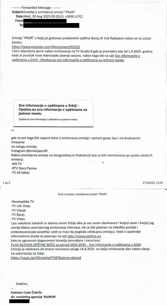 Po ugovoru opštine sa preduzetnikom Svetozar Čubrilo delatnosti reklamnih agencija „Kajron“ Popinci (Pećinci) o nabavci usluge emitovanja video priloga o dešavanjima u opštini i gostovanja predstavnika opštine u televizijskim emisijama zaključenog 8. avgusta 2025, preduzetnik je trebalo da „isporuči“ jedno televizijsko gostovanje na jednoj beogradskoj frekvenciji (s reemitovanjem na mreži lokalnih televizijskih stanica, na portalu opštine.eu…), te da se o tom gostovanju objavi vest na pomenutom portalu. Angažovani preduzetnik Svetozar Cvele Čubrilo, uz srdačne pozdrave, već 20. avgusta dostavio je izveštaj finansijeru o urađenom poslu.