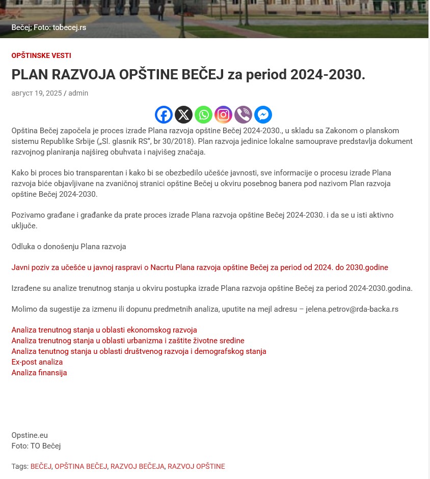 Na sajtu opstine.eu 19. avgusta 2025. godine objavljeno je da je opština Bečej započela izradu Plana razvoja, dokumenta koji je usvojen 15 meseci pre toga (Foto: Screenshot)