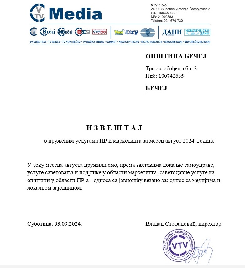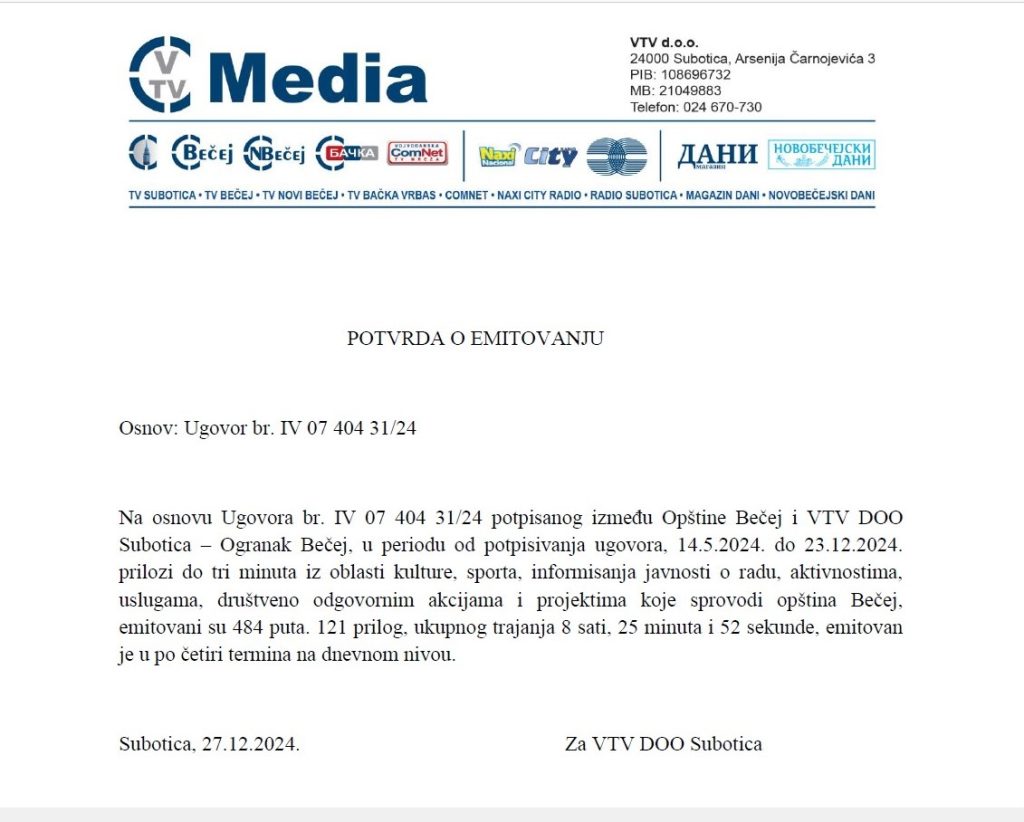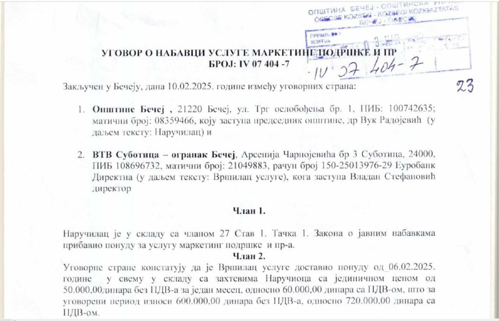 Početkom 2025. godine opština Bečej potpisala je ugovor sa VTV-om i o „nabavci usluge marketing podrške i PR“