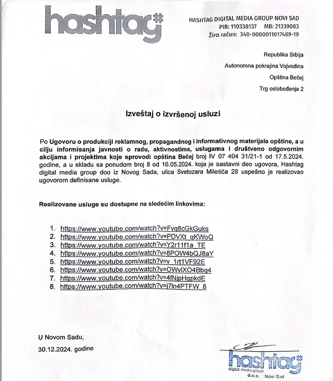 Izveštaj o izvršenoj usluzi „Hashtag Digital Media Group“ 2024. godine