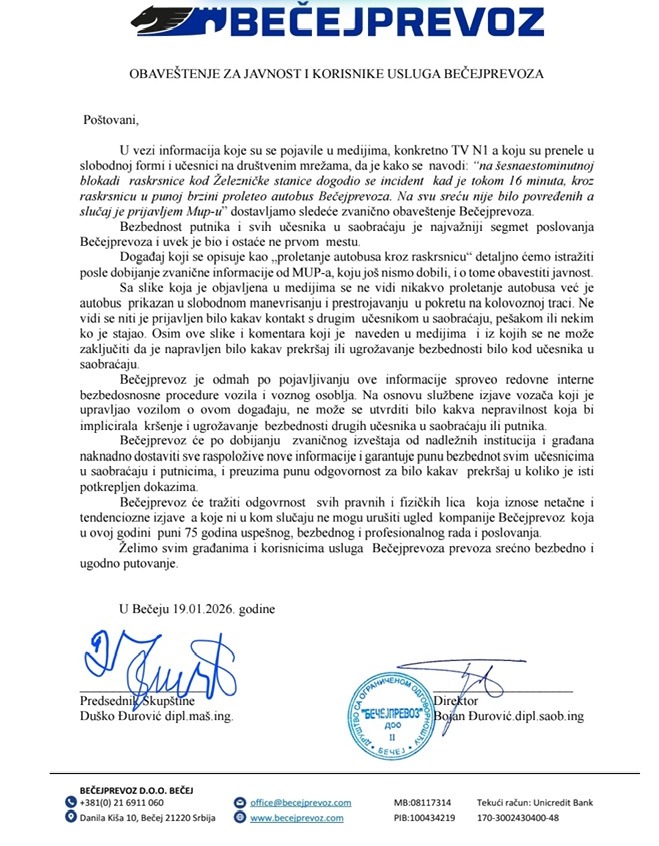 Nakon incidenta koji se dogodio 16. januara u Novom Sadu, kada je, prema pisanju medija, autobus Bečejprevoza prošao kroz raskrsnicu dok su građani mirno odavali poštu poginulima u padu nadstrešnice železničke stanice, iz kompanije poručuju da fotografije ne dokazuju prekršaj i najavljuju da će tražiti odgovornost onih koji iznose „netačne izjave“.