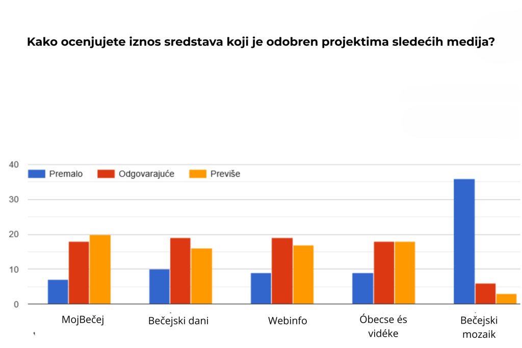 Drugačija je slika kod ostalih medijskih projekata. Projekat portala MojBečej je jedini gde je najviša narandžasta kolona – što znači da najveći broj građana smatra da je ovom portalu dodeljeno „previše“ novca. U slučaju medija Bečejski dani, Webinfo i Óbecse és vidéke situacija je slična – dominiraju odgovori da je iznos „odgovarajući“ ili „previše“, dok je broj onih koji smatraju da su dobili „premalo“ (plava kolona) sveden na minimum.
