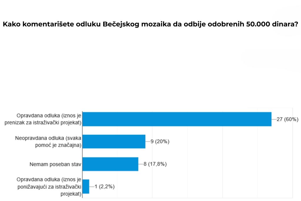 Jedno pitanje u anketi bilo je u vezi sa odlukom redakcije Bečejskog mozaika da odbije odobrenih 50.000 dinara na konkursu. Građani su stali uz ovakav potez – više od 60% ispitanika smatra da je reč o opravdanoj odluci jer je iznos prenizak za ozbiljan istraživački projekat.
