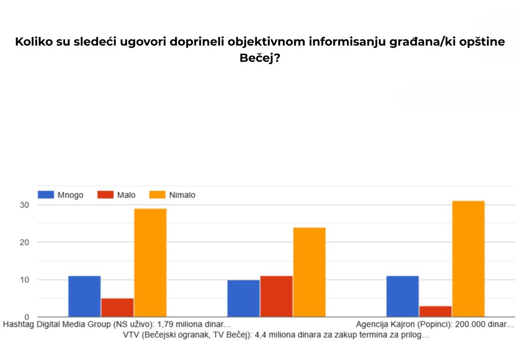 U slučaju Hashtag Digital Media Group (NS uživo, 1,79 miliona) 29 od 45 ispitanika smatra da ovaj medij nimalo nije doprineo informisanju građana Bečeja, 24 ispitanika je ocenilo da najskuplji ugovor, zaključen sa VTV (Bečejski ogranak, TV Bečej, 4,4 miliona) da zakup termina nimalo ne služi objektivnom informisanju. U slučaju agencije Kajron (200.000 dinara), iako je iznos manji, stav građana je još rigorozniji – ubedljivo najviša narandžasta kolona (31 glas) poručuje da je doprinos ovog ugovora nepostojeći.