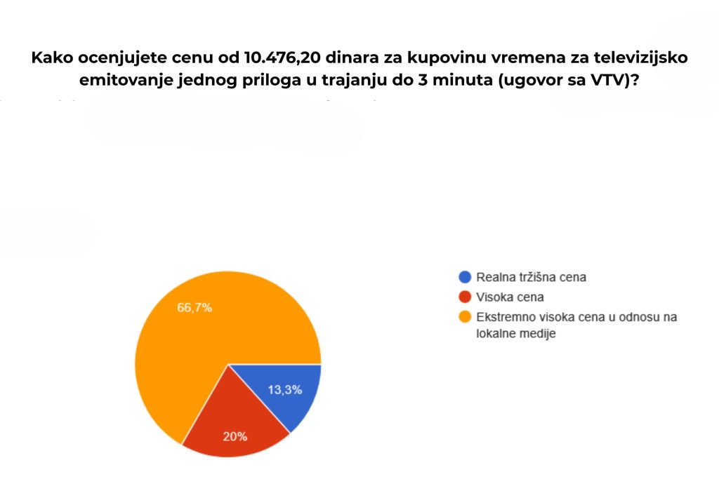 U slučaju VTV 66,7% anketiranih smatra da je cena od preko 10.000 dinara za kupovinu vremena za emitovanje priloga od 3 minuta, ekstremno visoka.