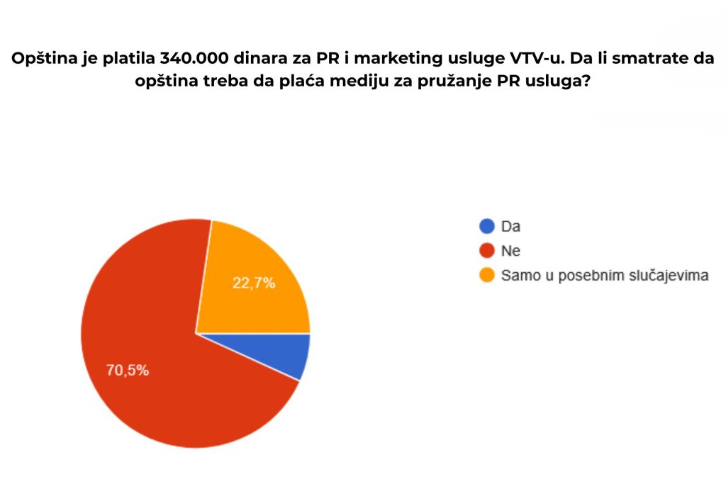 Tokom 2025. godine opština je platila i 340.000 dinara za PR i marketing usluge VTV-u. Dominantna većina (70,5%) učesnika ankete smatra da opština ne bi trebalo da plaća mediju za pružanje PR usluga.