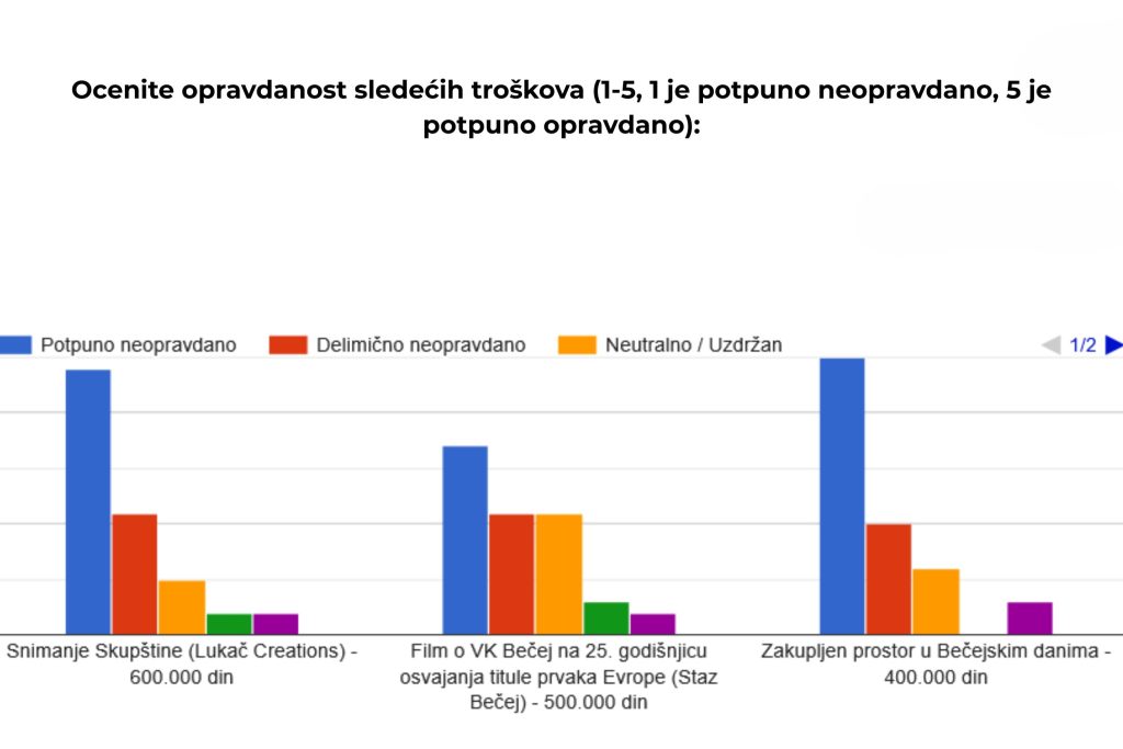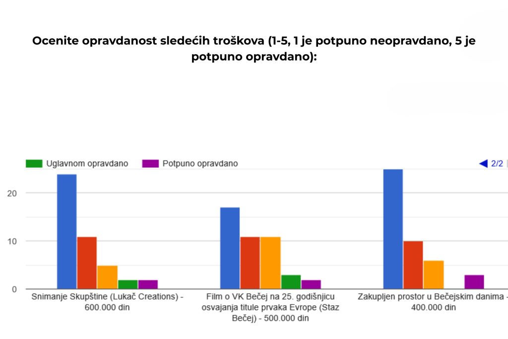 U anketi portala Bečejski mozaik (anonimni Google Forms upitnik), u kojoj je tokom marta meseca učestvovalo 45 građana i građanki, iskazano je nezadovoljstvo načinom trošenja budžeta. Treba napomenuti da ovakva vrsta anketiranja ne predstavlja reprezentativno istraživanje javnog mnjenja po naučnim standardima, ali ona ipak pokazuje puls dela javnosti. Čak i letimičan pogled na procente otkriva da učesnici ankete smatraju da se milionski iznosi troše na „propagandne mašinerije“.