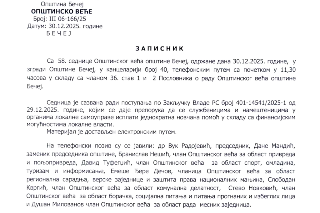 Odluka o isplati doneta je neposredno pred kraj kalendarske godine. Kako se navodi u zapisniku Opštinskog veća, telefonska sednica lokalne vlade sazvana je radi postupanja po zaključku Vlade Republike Srbije koji je donet samo dan ranije, 29. decembra.